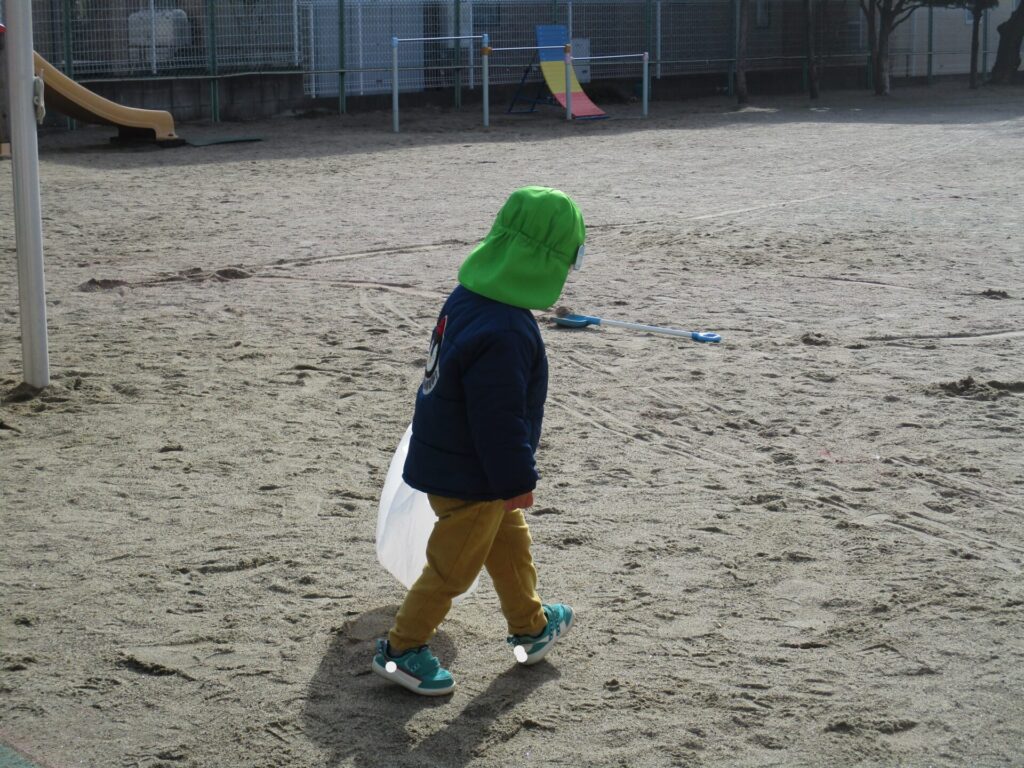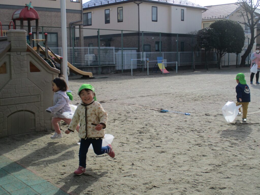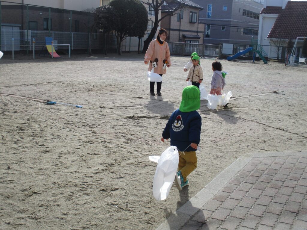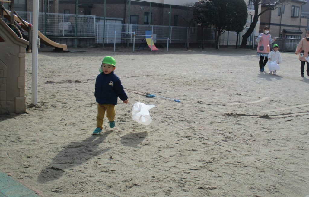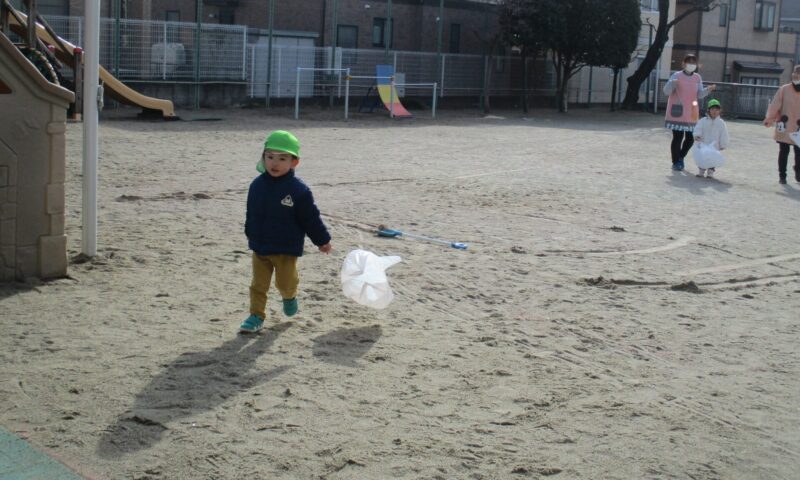 各学年、今日はお正月遊びをしていました。満3歳クラスは、ビニール袋を使ってたこあげをしていました。