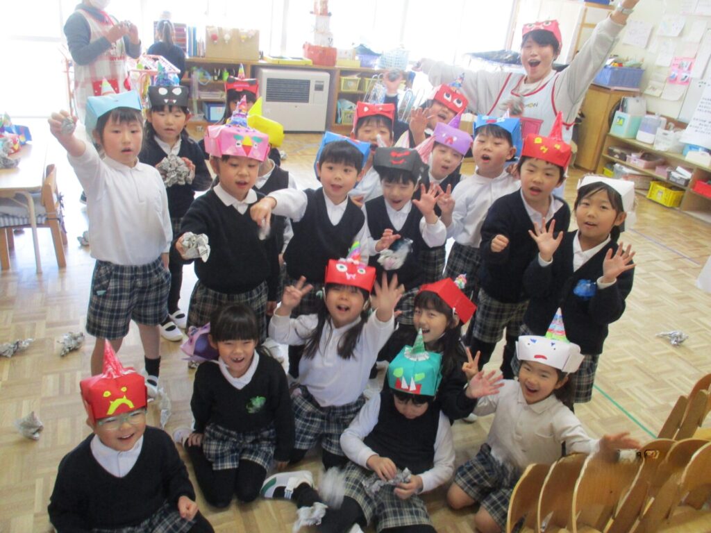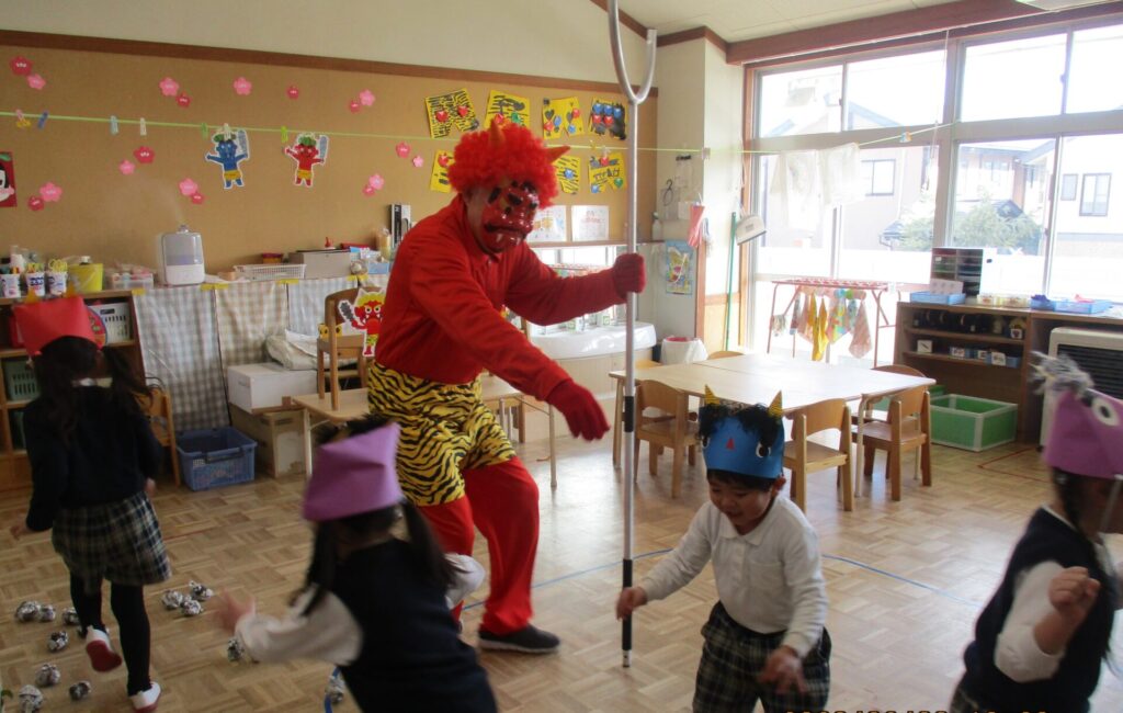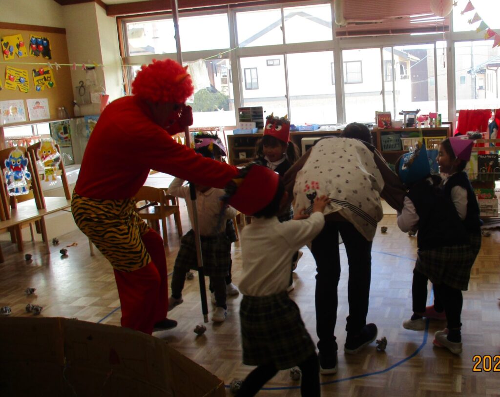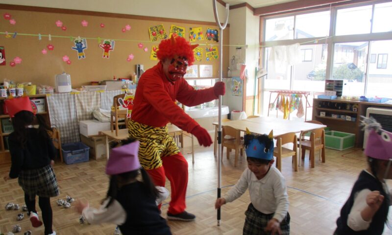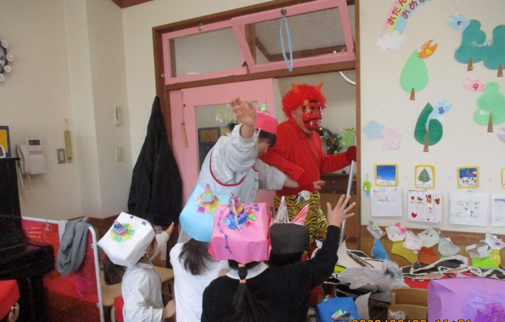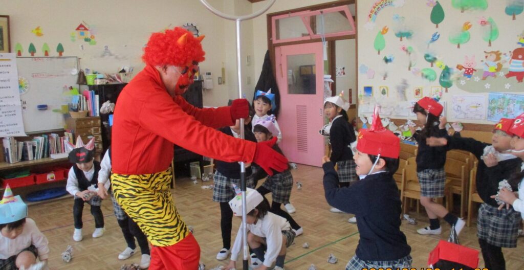 インフルエンザの猛威が幼稚園にもやってきました。学年閉鎖もありました。はやくみんなが元気に揃って園生活が送れますように祈るばかりです。豆まきも、感染予防のために、クラスごとに行いました。なんと鬼が各クラスに現れました!!みんなどうやって退治したのかな!?