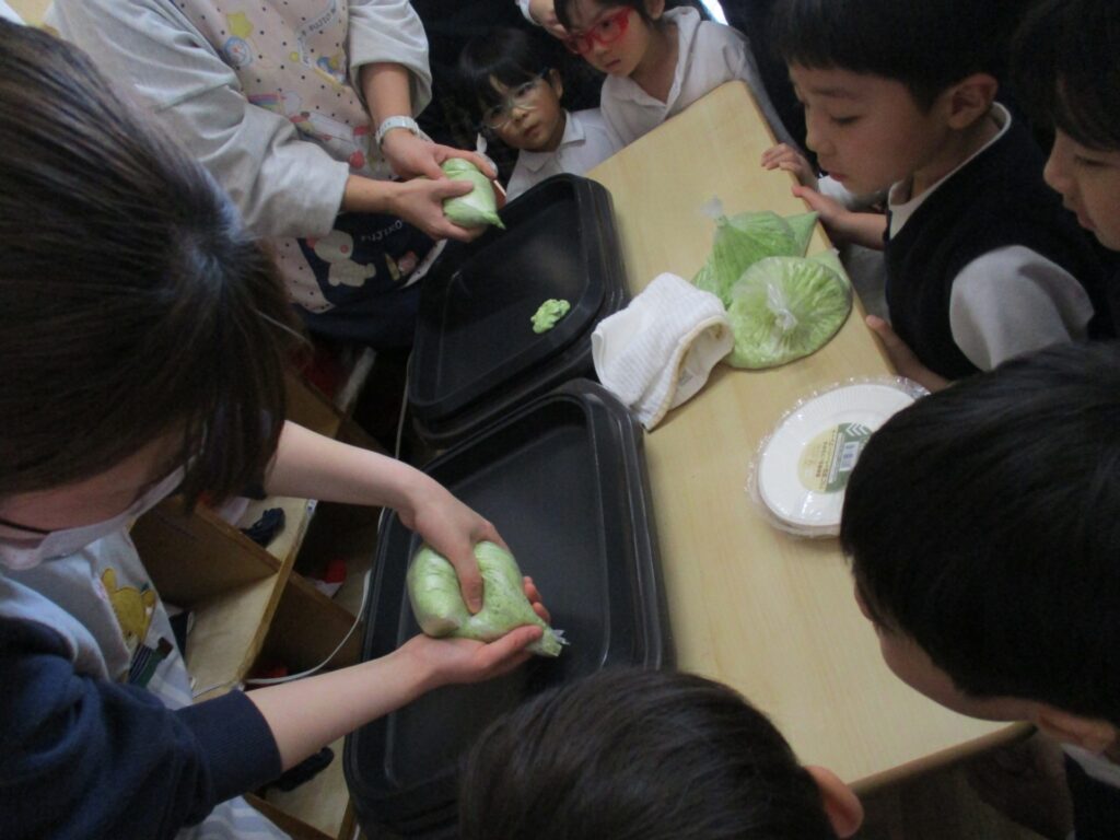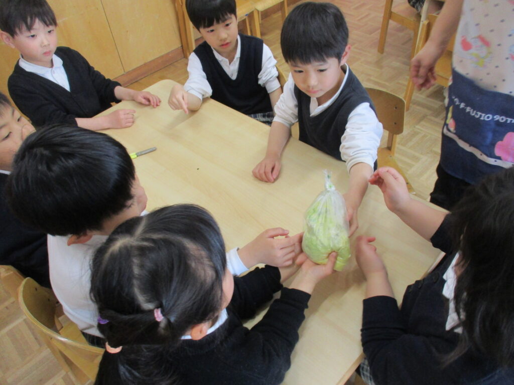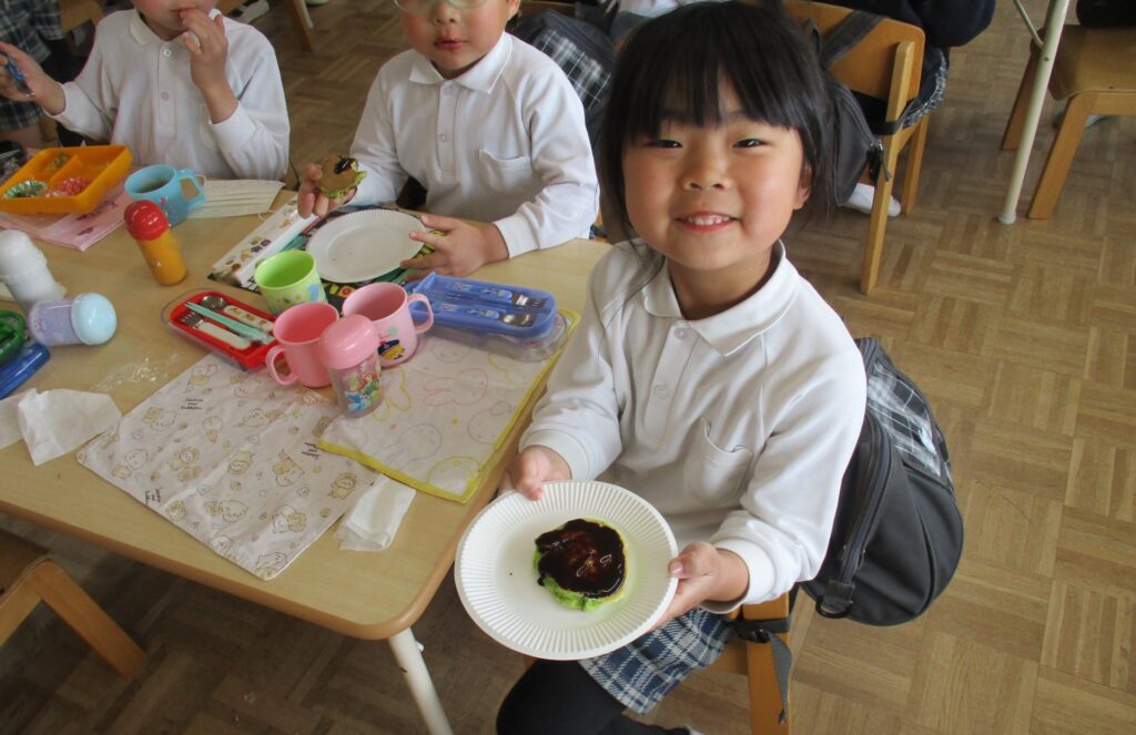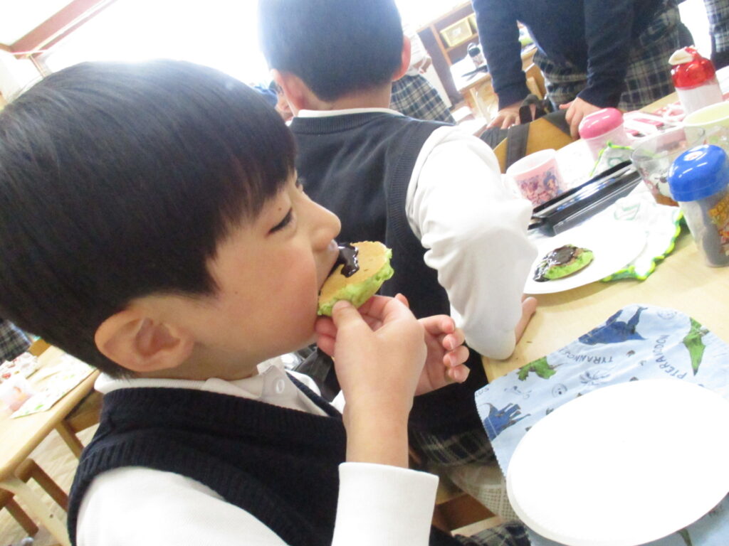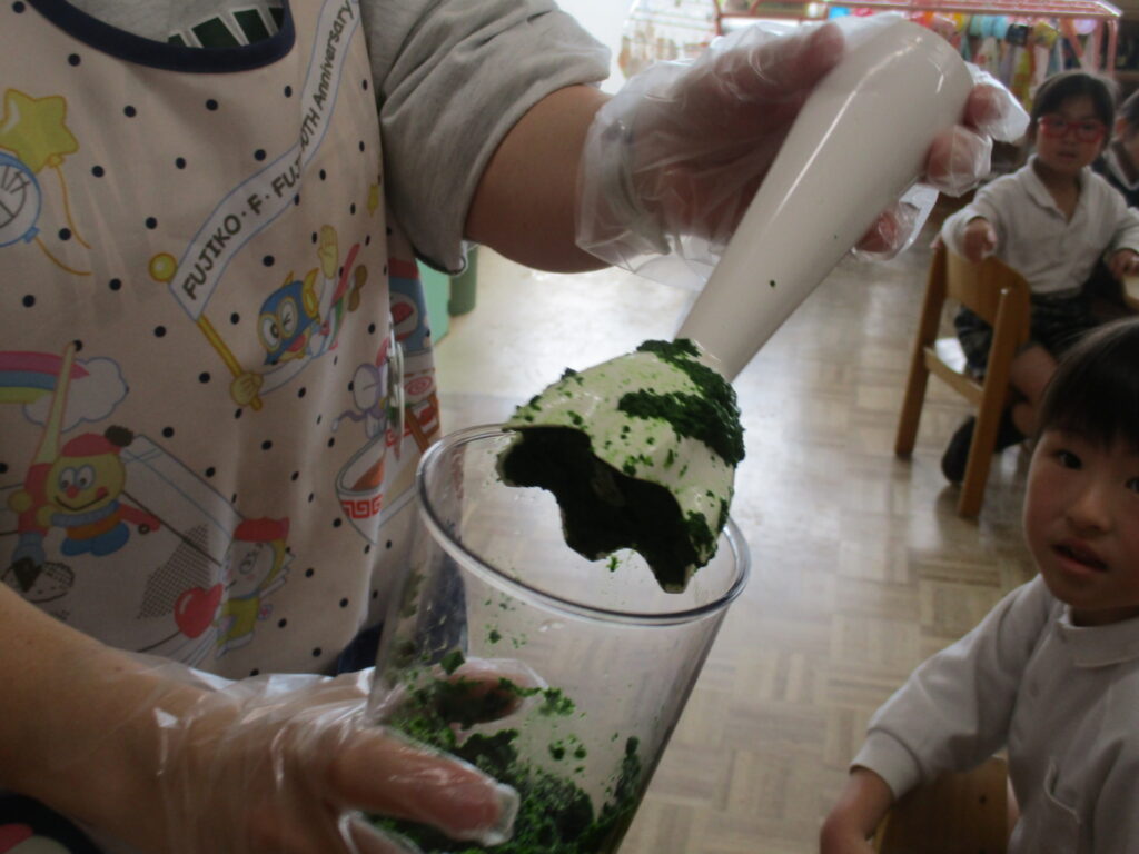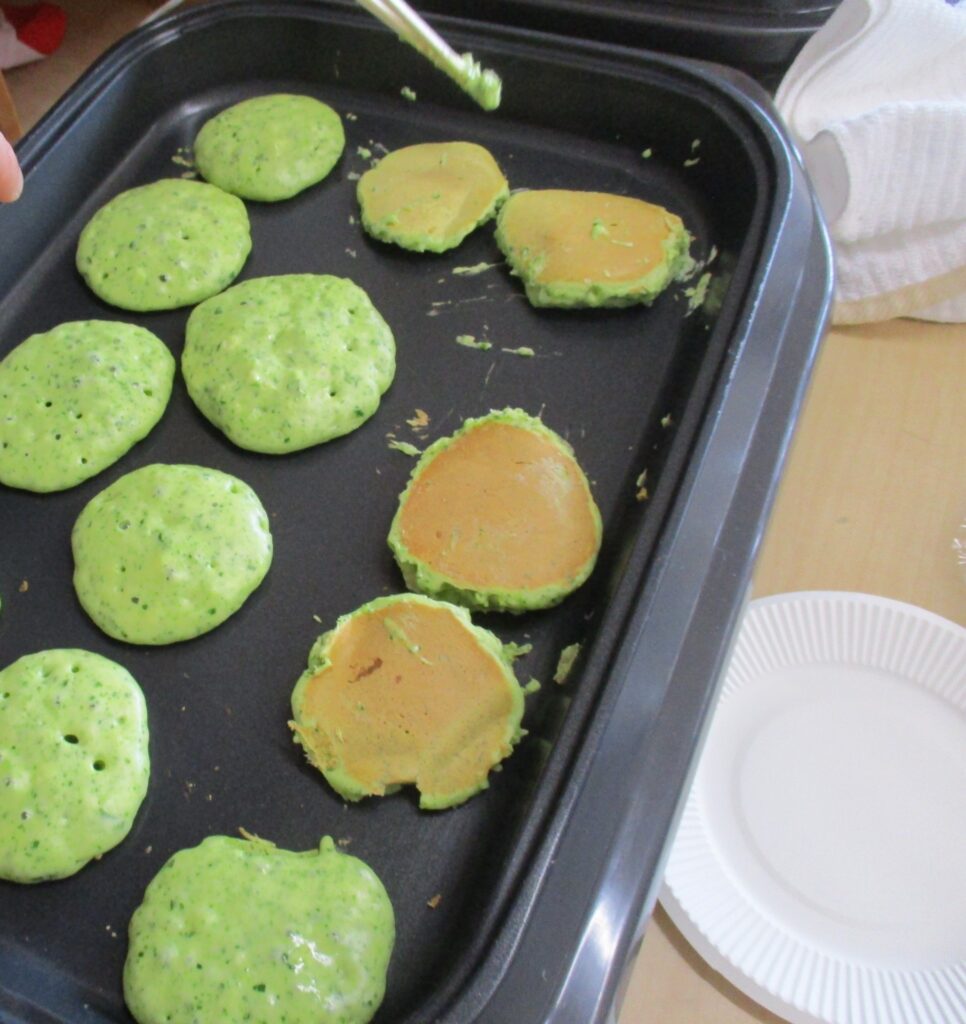 畑で育ったほうれん草を収穫した年長組。「パーティをするからぜひどうぞ。お昼も一緒に食べましょう!」とご招待を受けたので、年長組へ行ってきました。すると!なんと!収穫したほうれん草で、パンケーキパーティをするとのこと。\(◎o◎)/!さあどんなパンケーキかな!?