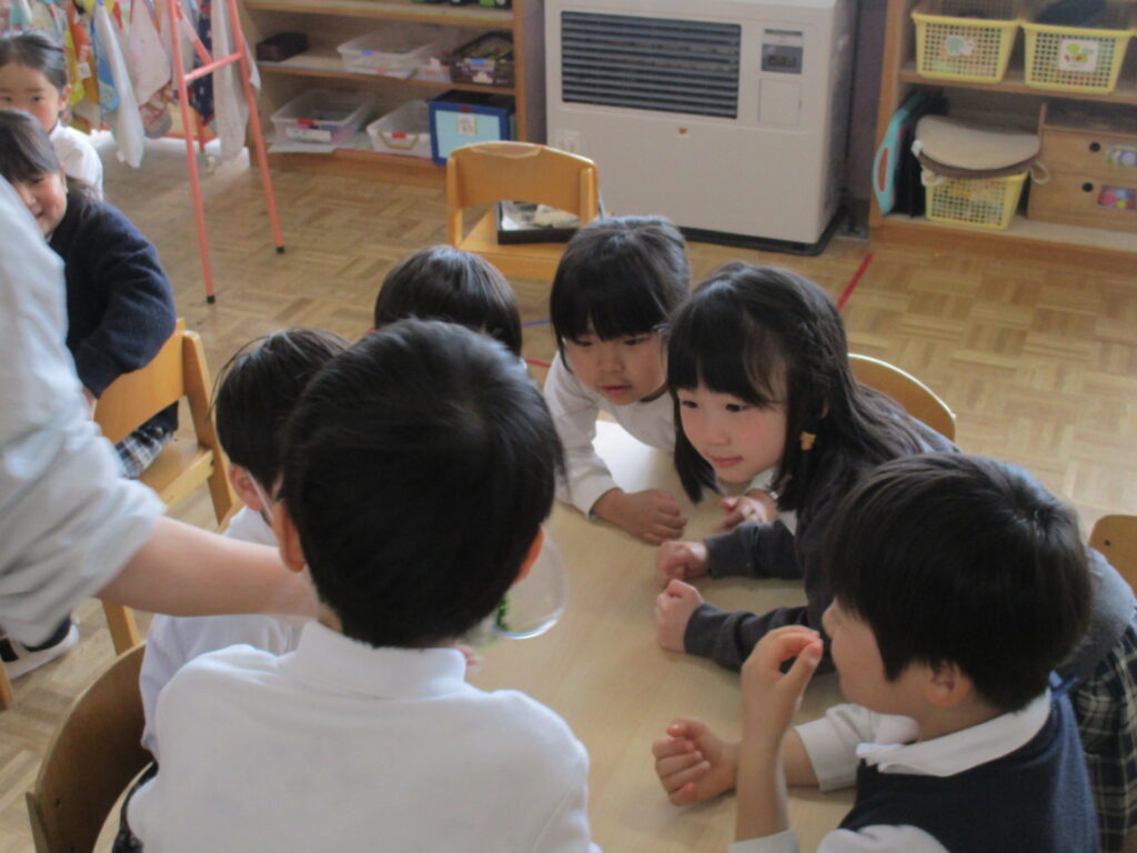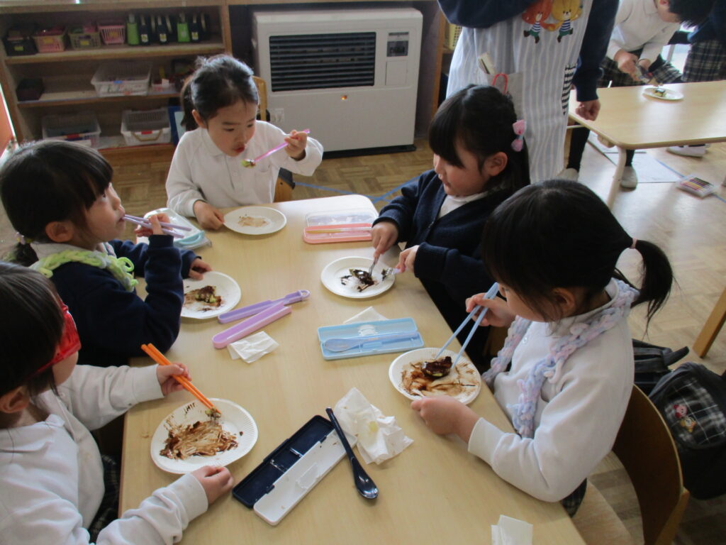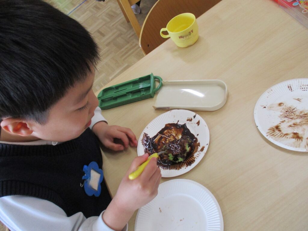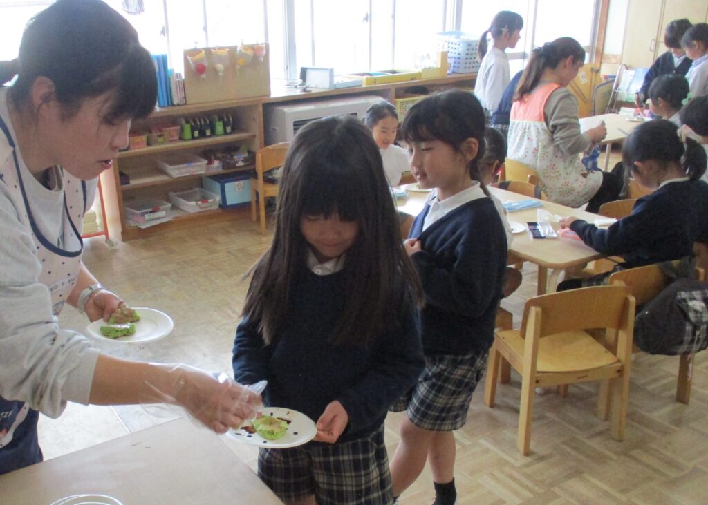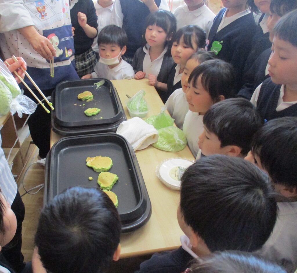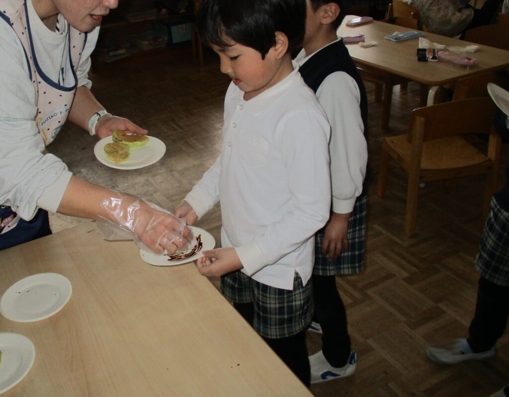 畑で育ったほうれん草を収穫した年長組。「パーティをするからぜひどうぞ。お昼も一緒に食べましょう!」とご招待を受けたので、年長組へ行ってきました。すると!なんと!収穫したほうれん草で、パンケーキパーティをするとのこと。\(◎o◎)/!さあどんなパンケーキかな!?
